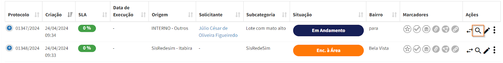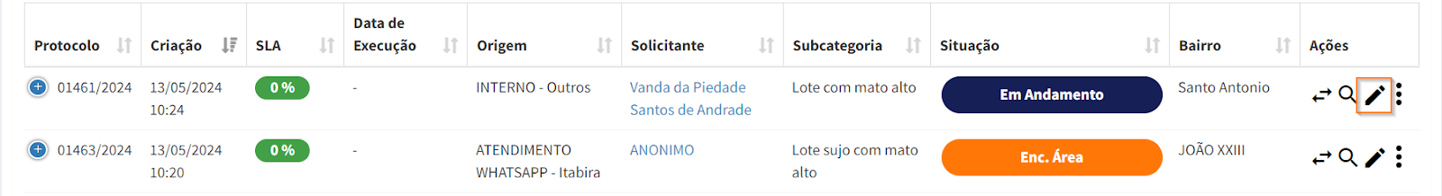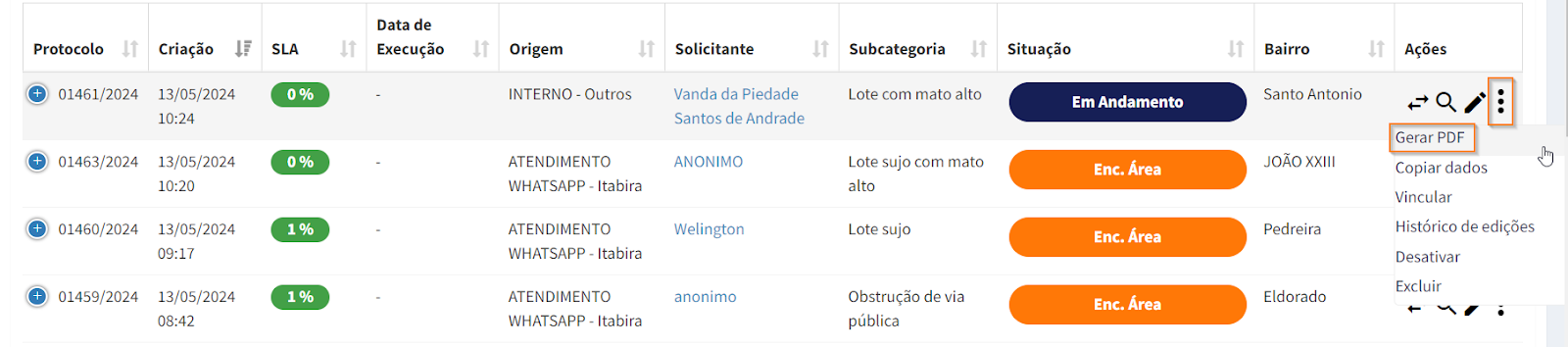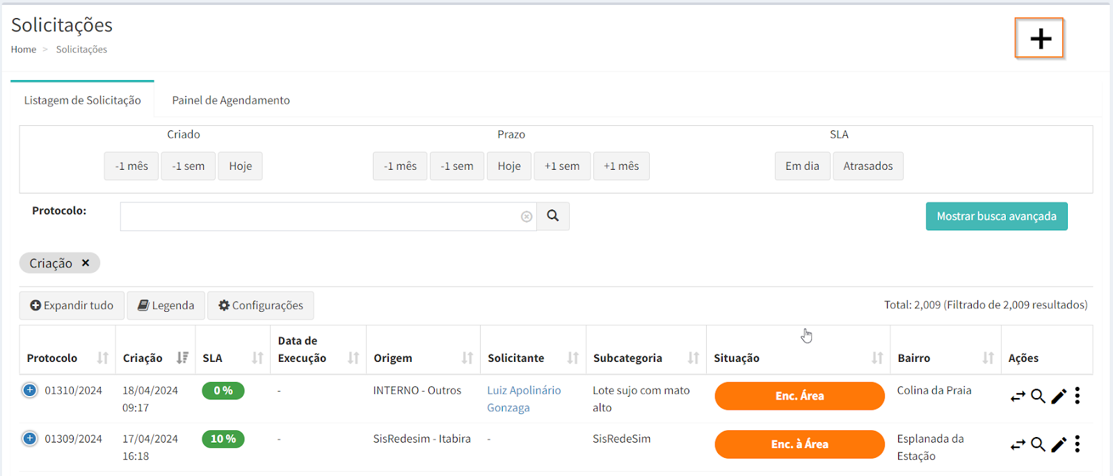 No menu "Solicitações", você pode ver uma lista de todas as solicitações cadastradas, incluindo as seguintes informações: número de protocolo (gerado automaticamente pelo sistema), data de criação, SLA, data de execução, origem, solicitante, subcategoria, situação e bairro.