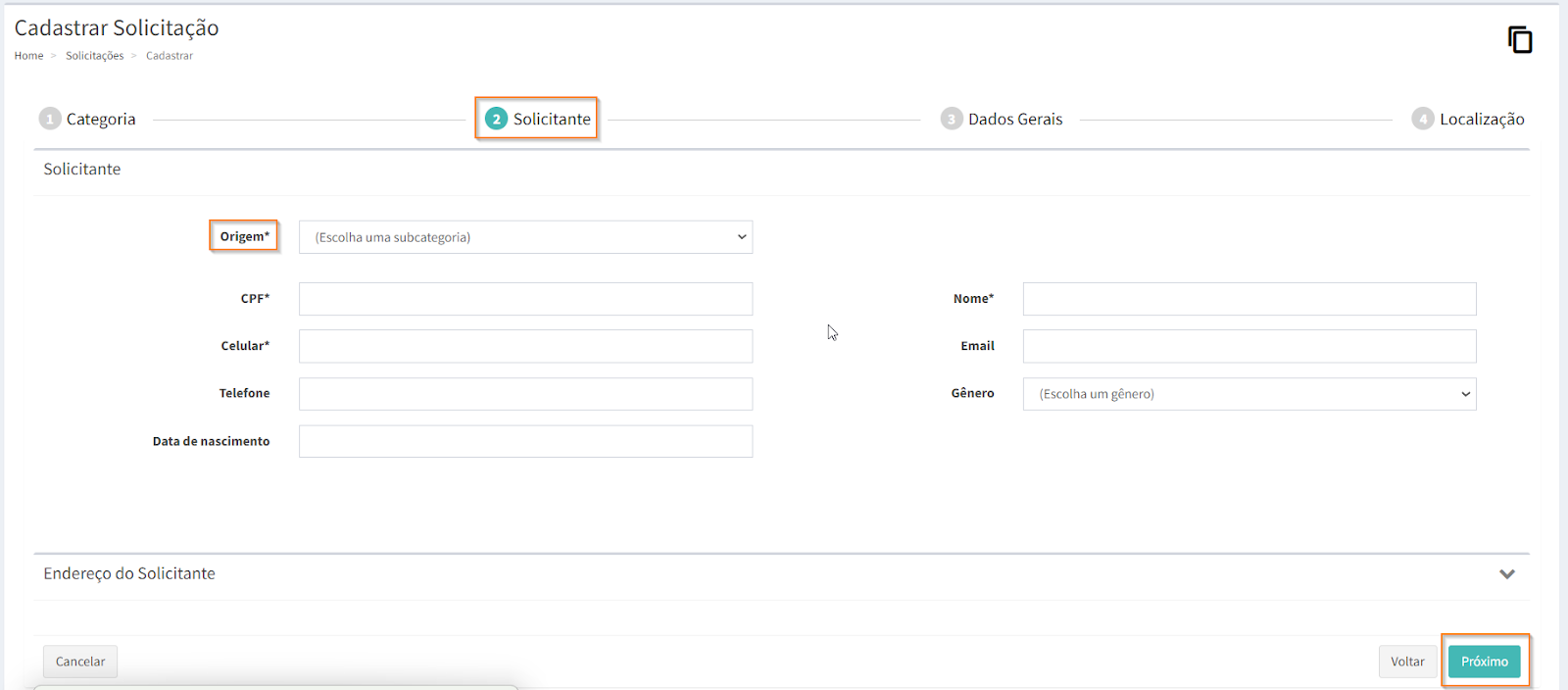 Na aba “Solicitante”, selecione a origem da solicitação e preencha as informações do solicitante, de acordo com a origem selecionada. Após preencher todos os campos necessários, clique em .