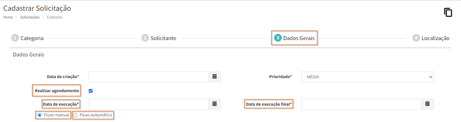 Ao realizar o agendamento de uma solicitação, o sistema emite um aviso que a data para o agendamento substitui a data prazo original da subcategoria do serviço. Então, selecione a “Data de execução” e “Data de execução final” da solicitação e, por último, selecione o “Fluxo manual” ou “Fluxo automático”.
