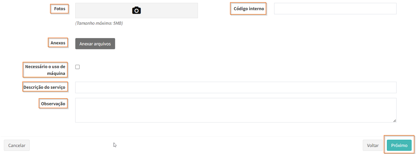 . É possível ainda marcar a opção “Necessário o uso de máquina” e preencher os campos opcionais “Descrição do serviço” e “Observação”. Após inserir as informações necessárias, avance para a última etapa, clicando em