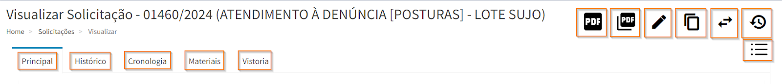 É possível visualizar as abas “Principal”, “Histórico”, “Cronologia”, “Materiais” e “Vistoria”. Além disso é possível gerar arquivo em PDF , gerar PDF detalhado