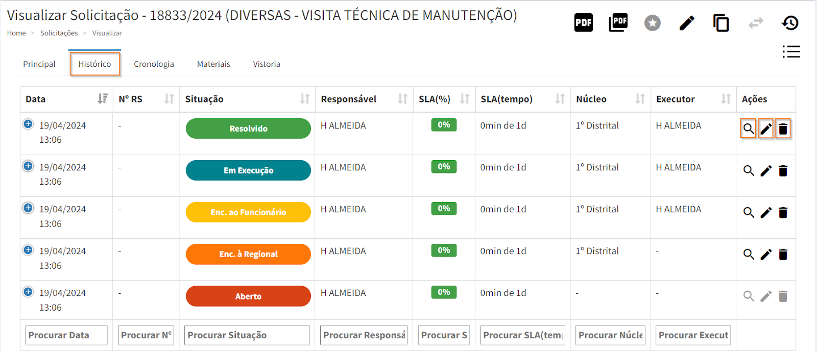 Em seguida, clique na aba “Histórico”, para visualizar todas as alterações de situações da solicitação realizadas pelos usuários e demais informações complementares. Além disso, na coluna de Ações, é possível visualizar , editar