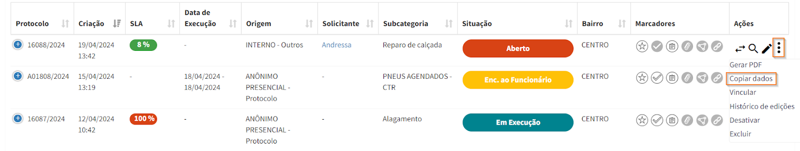 Para copiar dados, clique no ícone , localizado na coluna de “Ações” e, em seguida, selecione a opção “Copiar dados”.