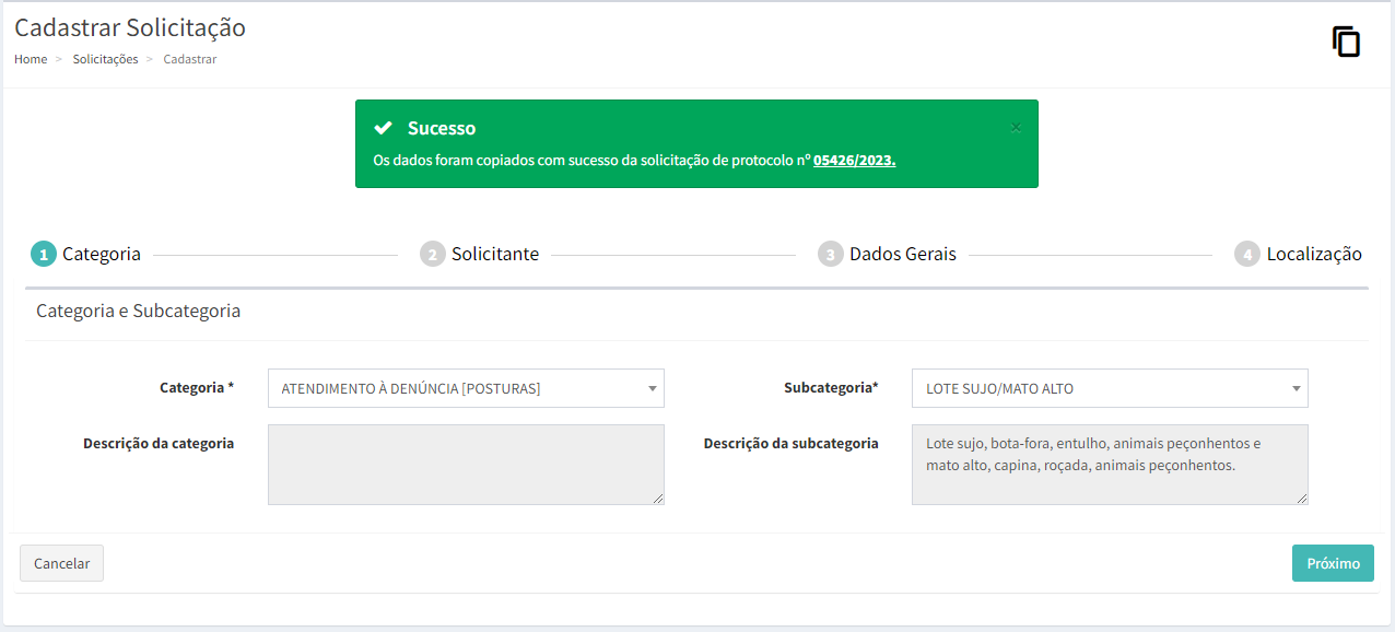 É exibida, então, a página de cadastro de solicitação com os campos já preenchidos com os dados copiados da solicitação selecionada. Revise os dados e, caso necessário, realize as alterações conforme a nova solicitação a ser cadastrada. Ao finalizar, clique em .