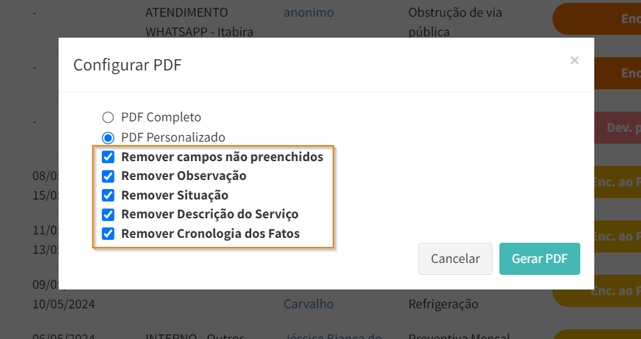 No caso do “PDF Personalizado”, é possível selecionar opções que permitem remover algumas informações do documento, conforme seja necessário.