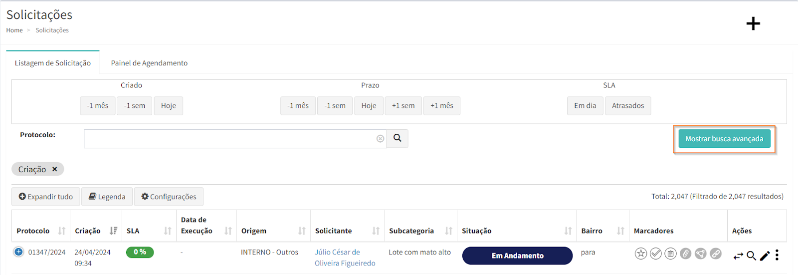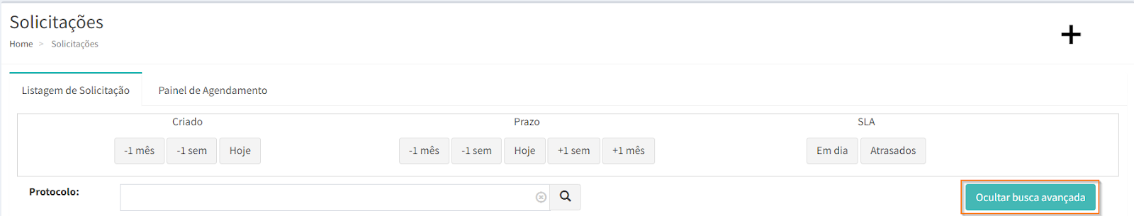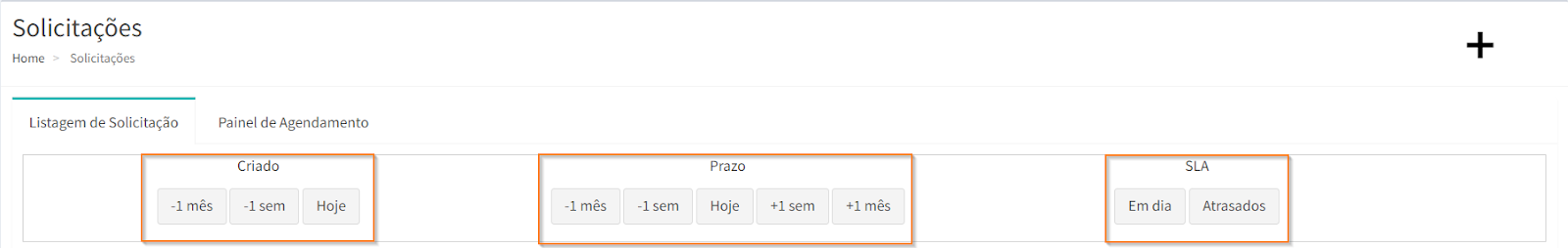 Na parte superior da página de listagem de solicitações, é possível realizar um filtro rápido de solicitações através de 3 critérios: “Criação”, “Prazo” e “SLA”.