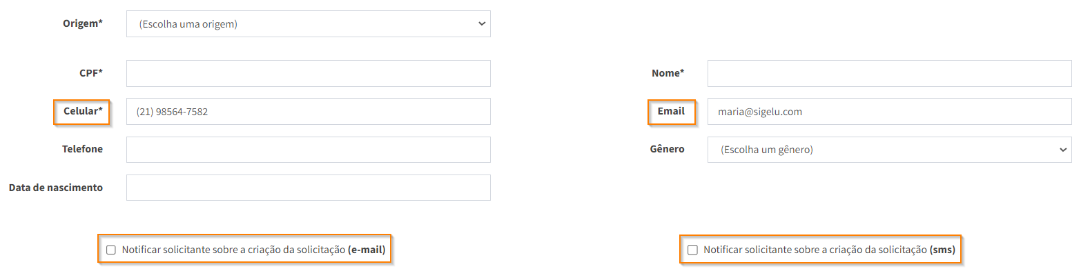 Importante: Caso precise notificar o solicitante através de uma notificação, por e-mail ou celular, com informações referentes ao andamento da solicitação, é necessário preencher os respectivos campos e ativar as opções de notificação por e-mail ou SMS.