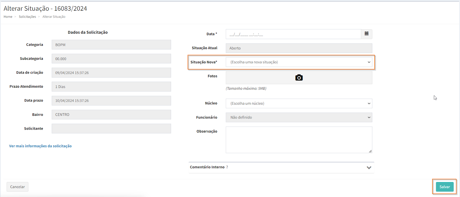 Atenção: É obrigatório preencher o campo “Data” para a alteração da situação de uma solicitação.