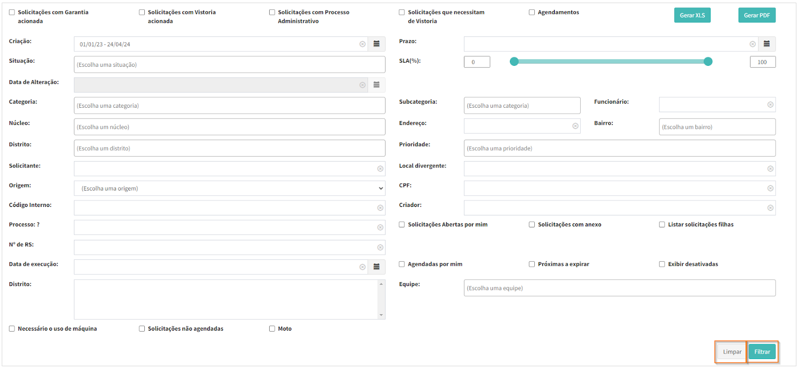 Basta selecionar uma das opções disponíveis para que o filtro retorne as solicitações desejadas. Para desabilitar os filtros, é necessário clicar novamente para que a ação seja desfeita.
