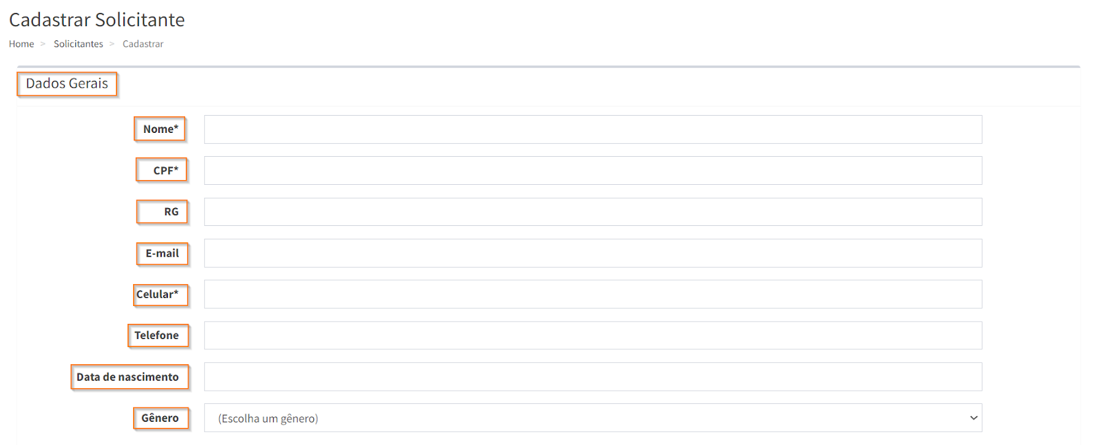 Em “Dados Gerais”, preencha os campos obrigatórios nome, CPF e celular. Caso seja necessário, preencha também os campos RG, e-mail, telefone, data de nascimento e gênero.