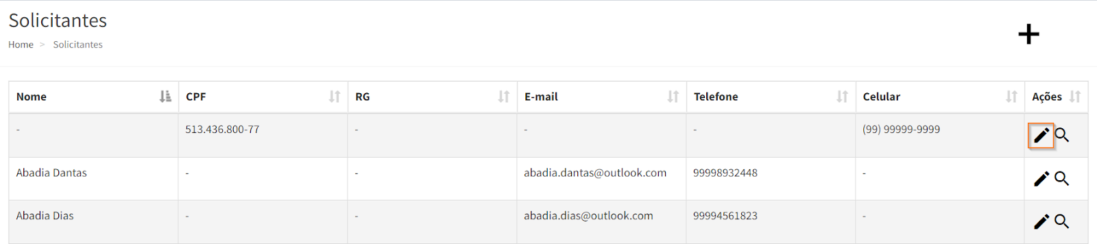 Para cadastrar, acesse o menu “Solicitantes” e clique no ícone , localizado no canto superior direito da página.