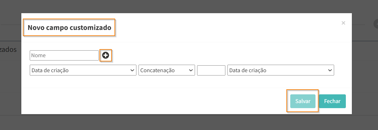 Importante: Ao criar um “Campo customizado”, é necessário inserir o nome desse campo, selecionar o primeiro campo padrão, selecionar o valor no campo operador, inserir um separador e selecionar o segundo campo padrão. Então, basta clicar no ícone para adicionar e em