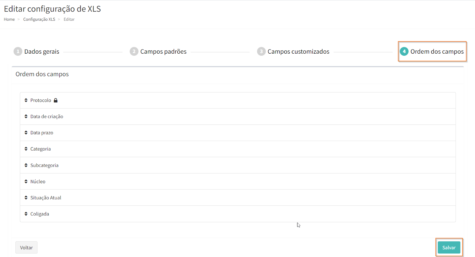 Em “Ordem dos campos”, basta clicar nos campos que deseja ordenar e arrastar o mouse para cima ou para baixo. Após reordenar os campos, clique em .