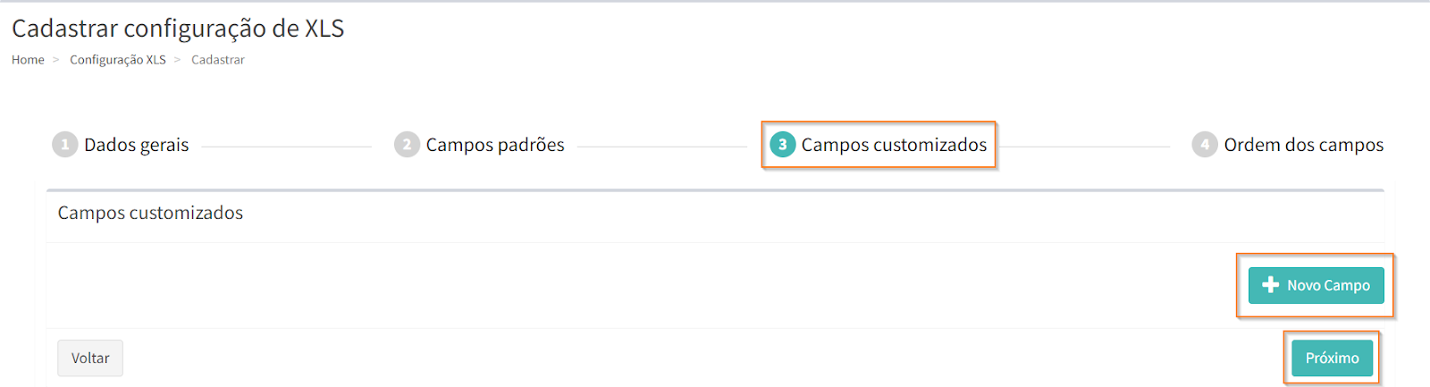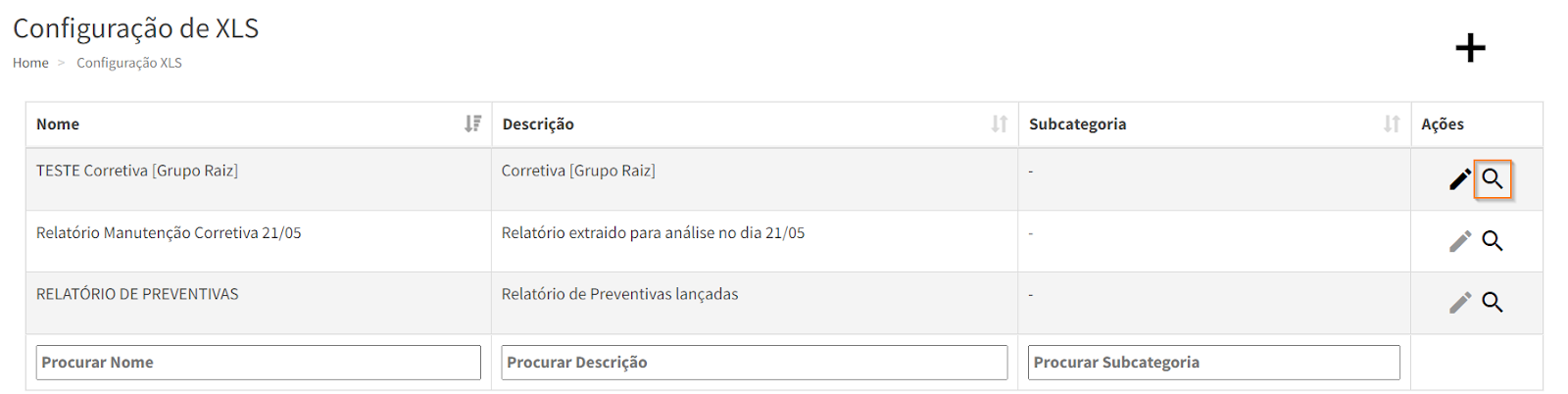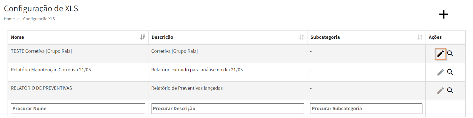 Para configurar um relatório XLS, acesse o menu “Configuração de XLS” e clique no ícone , localizado no canto superior direito da página.