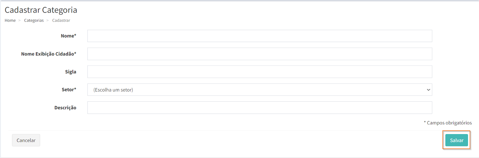 Importante: Toda categoria, no ato de sua criação, deve estar associada a um setor. Após ser criada, a categoria passa a ser exibida para todos os usuários que estejam associados a pelo menos um dos núcleos desse setor.