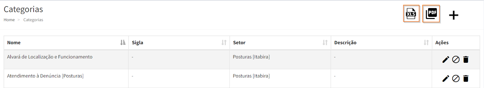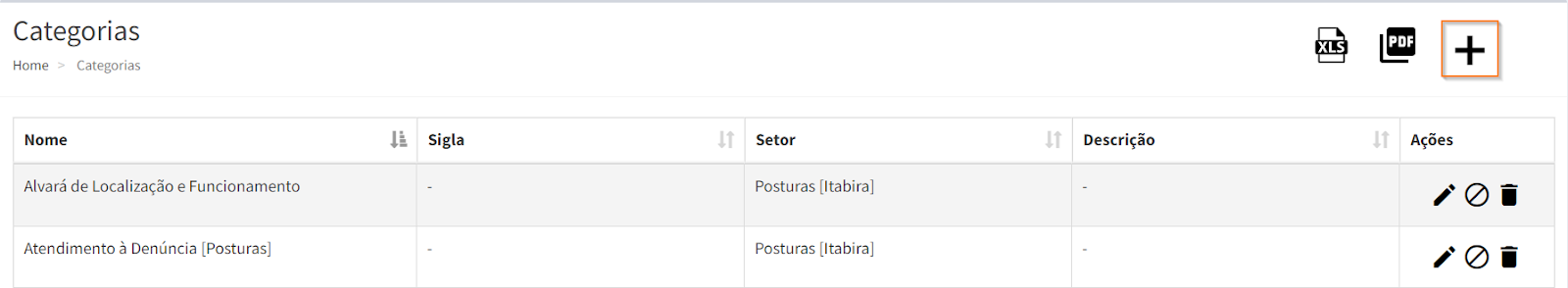 Para cadastrar, acesse o menu “Categorias” e clique no ícone , localizado no canto superior direito da página.