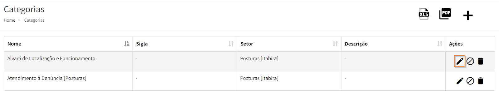 Para editar, clique no ícone , localizado na coluna de ações. Após realizar as edições necessárias, clique em