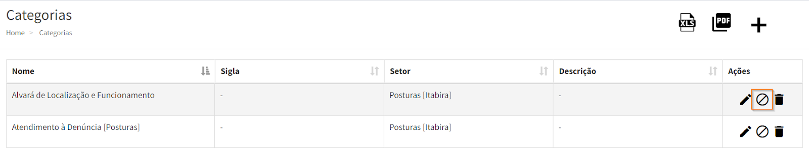 Para desativar, clique no ícone , localizado na coluna de ações e confirme a desativação.