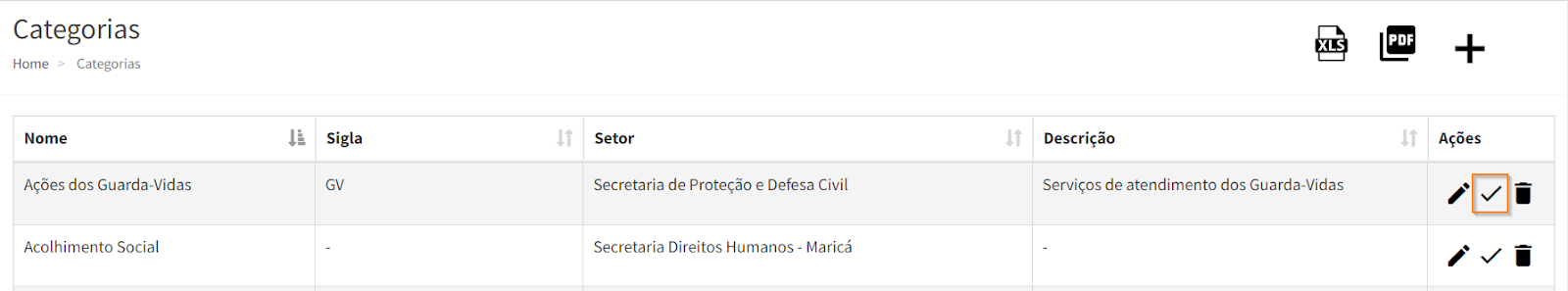 No SIGELU Atende, os usuários podem cadastrar, gerar relatórios em PDF e XLS, editar, desativar e excluir categorias, dependendo das permissões de seu perfil.