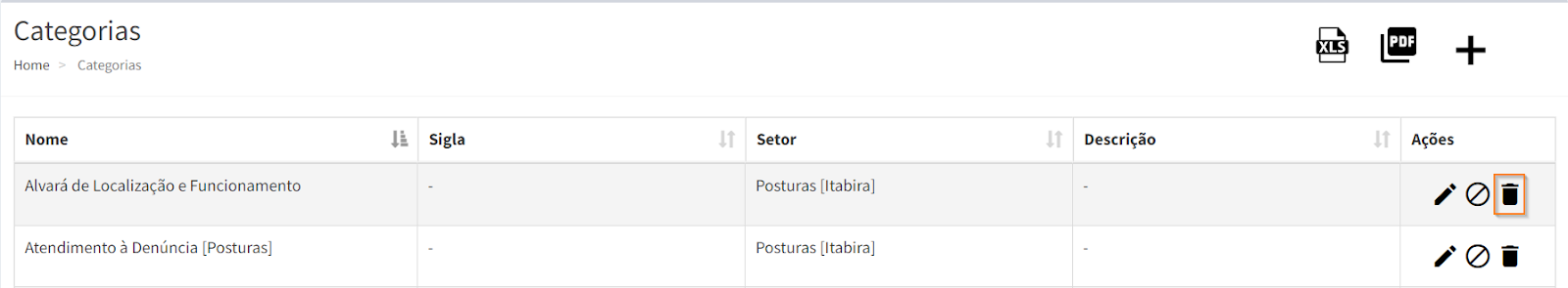 Para excluir, clique no ícone , localizado na coluna de ações e confirme a exclusão.