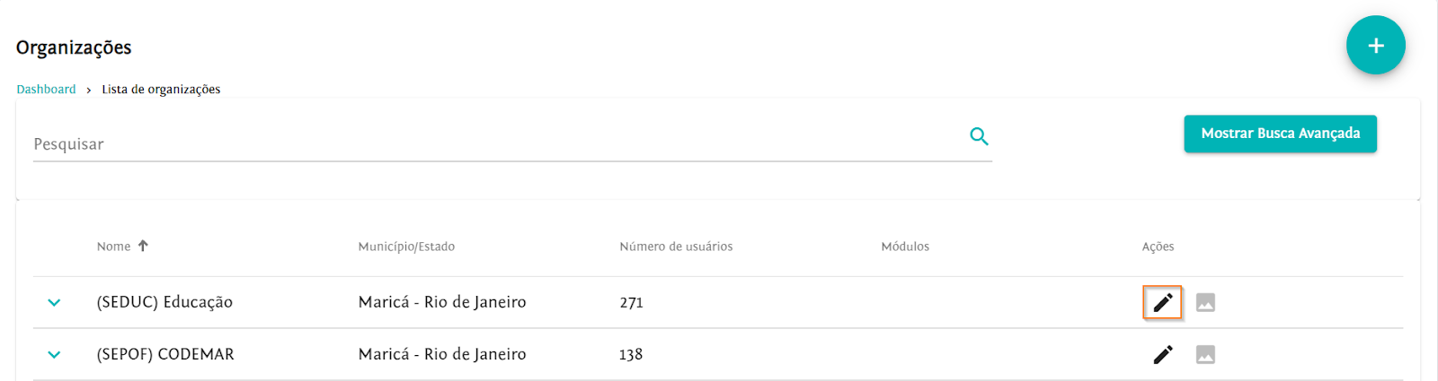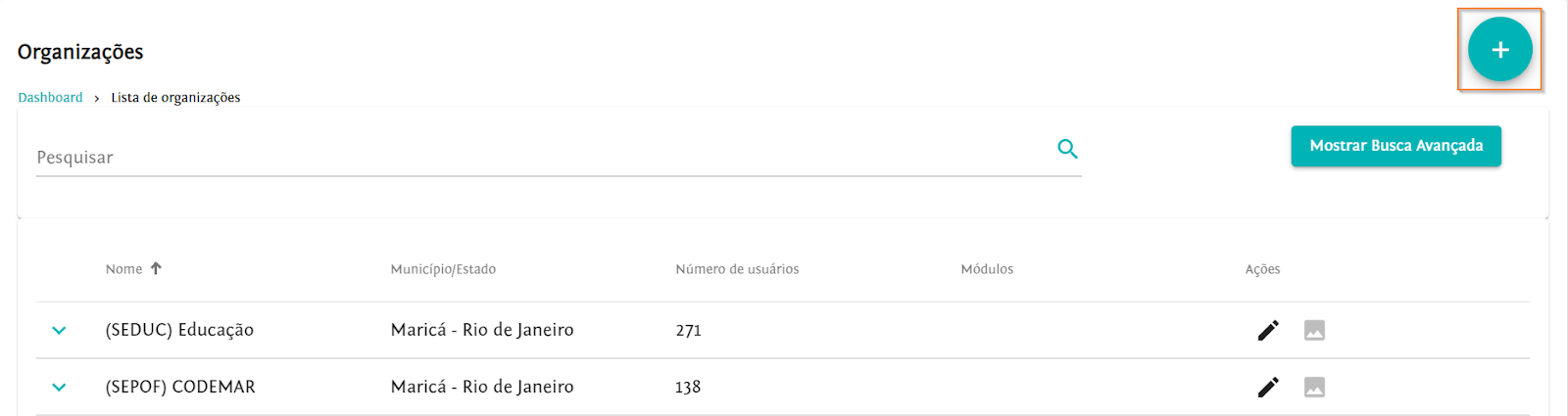 Ao logar na página inicial do SIGELU e clicar no ícone , você pode acessar a área de Organizações. Nesta área é possível visualizar informações da sua organização, cadastrar novas organizações e visualizar suas informações.