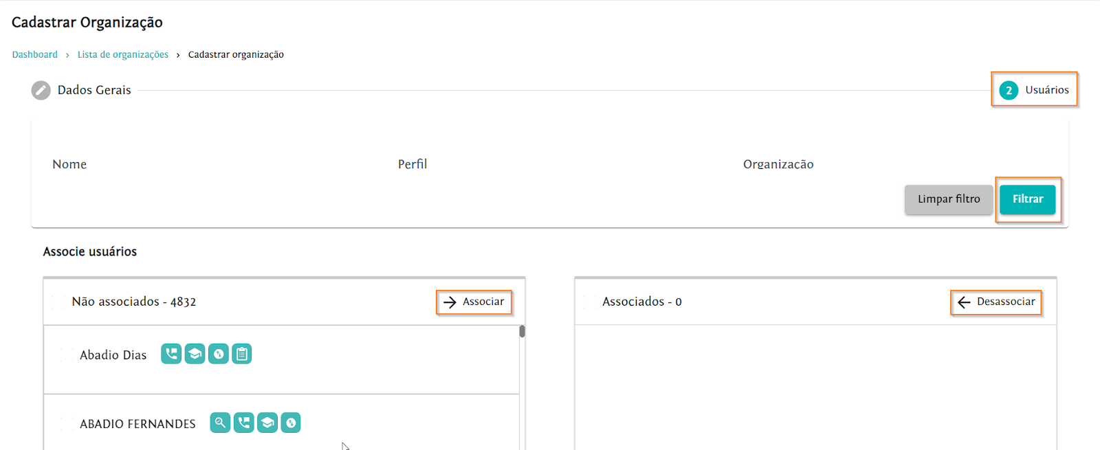 Em “Usuários”, associe os usuários que devem fazer parte da nova organização. É possível buscar pelo nome, perfil ou organização do usuário, clicando em ou buscar manualmente pelo nome, na aba “Não associados”. Para associar, clique no nome do usuário desejado e clique em