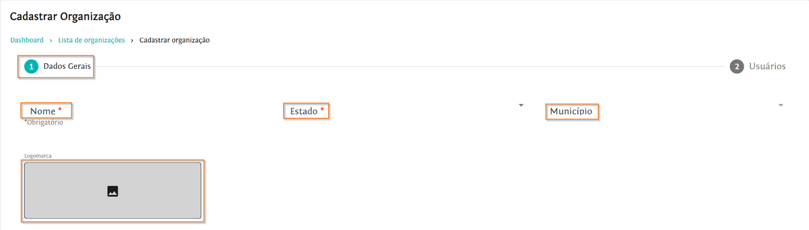 Na seção “Dados Gerais”, insira o nome, o estado, o município e a logomarca da nova organização. Introduza a localização na barra de pesquisa, marque o ponto no mapa interativo exibido na tela e clique em .