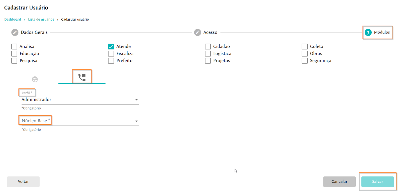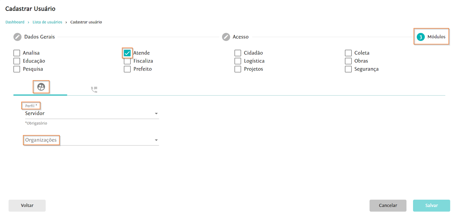 Na aba “Módulos”, em , selecione o perfil vinculado à organização e a qual(is) organização(ões) o usuário deve pertencer. Então, selecione o(s) módulo(s) ao(s) qual(is), o usuário deve ser associado, nesse caso o módulo Atende.