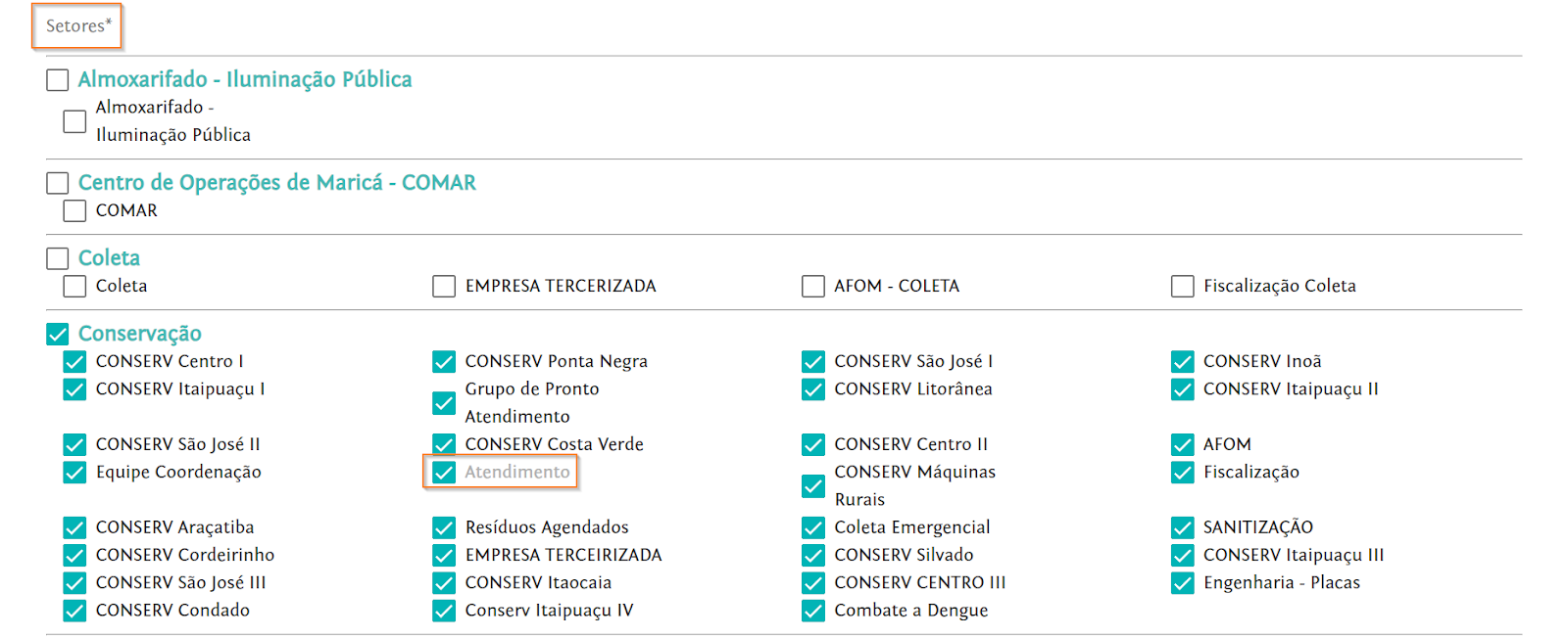 Ao selecionar o Núcleo Base, o usuário fica automaticamente associado ao setor ao qual esse núcleo pertence, isto é, associado a todos os núcleos dentro desse setor. Conforme seja necessário, é possível desvincular o usuário desses núcleos, exceto do Núcleo Base (destacado na cor cinza), e também associá-lo a outros setores ou núcleos desejados.