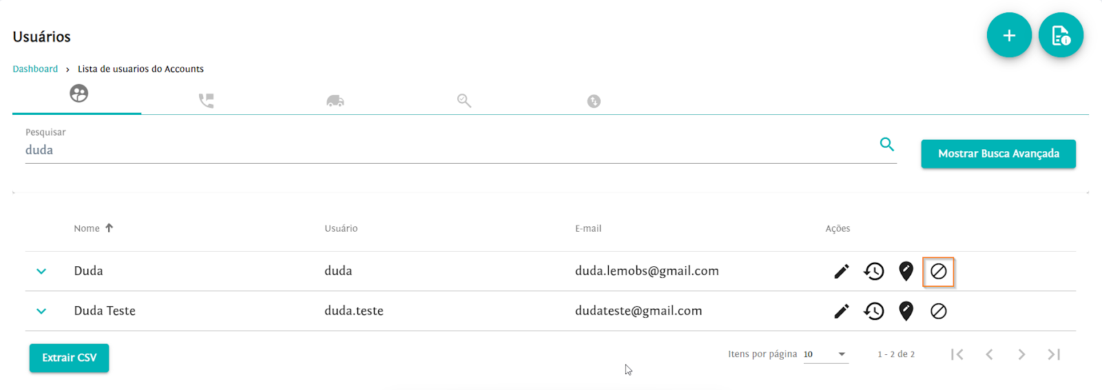 Ao desativar o usuário, seu acesso será bloqueado temporariamente e para permitir o acesso será necessário ativar o usuário novamente. Para desativar, clique no ícone , localizado na coluna de ações. Caso o usuário esteja desativado, clique em
