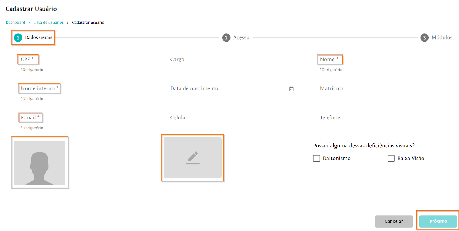 Na aba “Dados Gerais”, preencha os campos obrigatórios, como CPF, Nome, Nome interno e E-mail e, caso necessário, os demais campos livres. É permitido adicionar foto do usuário e um arquivo de assinatura, conforme destacado nas imagens abaixo. Ao finalizar, clique em .