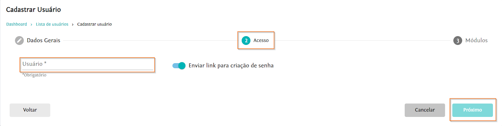 Lembre-se, ao desmarcar a opção ‘’Enviar link para criação de senha’’, o usuário não receberá um e-mail de notificação. Informe ao usuário as orientações para o acesso.