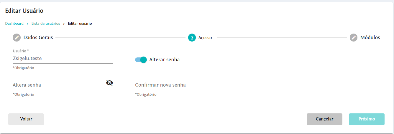 Para alterar a senha, clique em e selecione a etapa de ‘’Acesso’’. Selecione a opção ‘’Alterar senha’’, e ao abrir o campo para alteração digite a nova senha e confirme.