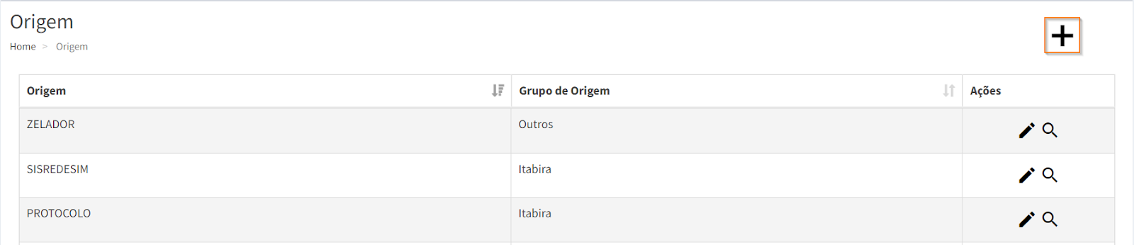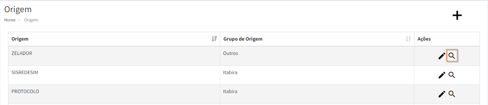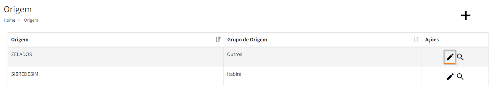 Para cadastrar, acesse o menu “Origem” e clique no ícone , localizado no canto superior direito da página.