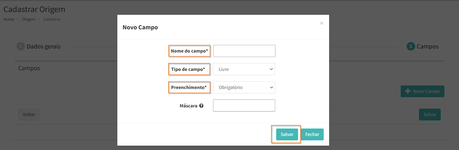 Na aba “Campos”, cadastre os campos necessários a serem preenchidos ao cadastrar uma solicitação associada a essa origem. Basta clicar em , preencher as informações necessárias e clicar em