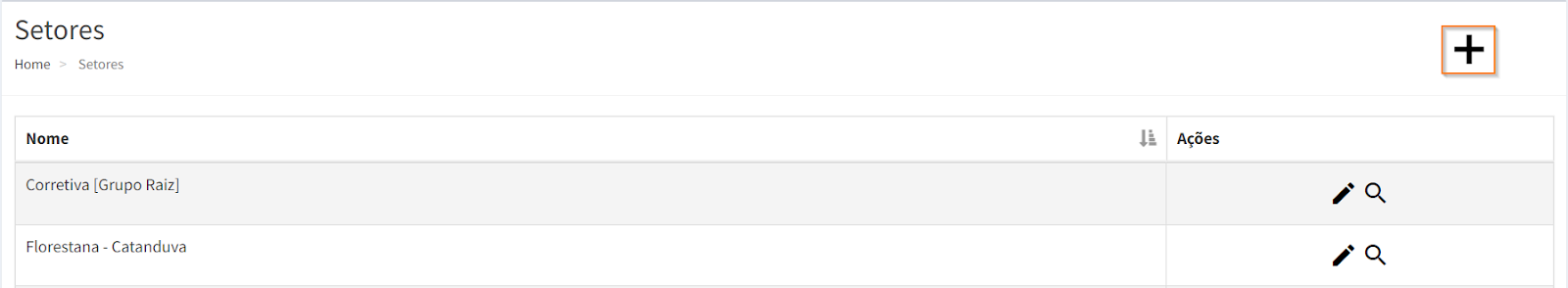 Para cadastrar, acesse o menu “Setor” e clique no ícone , localizado no canto superior direito da página.