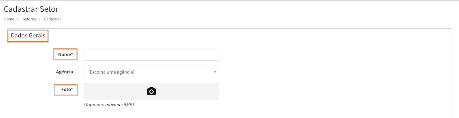 Em “Dados Gerais”, preencha o campo obrigatório nome e clique em para escolher uma foto que represente o setor.