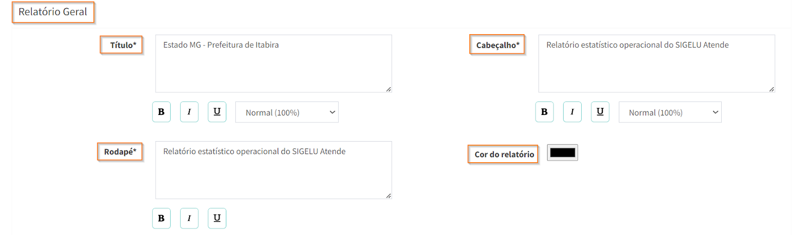 Em “Relatórios em PDF” e em “Relatório Geral”, preencha os campos obrigatórios. É possível também definir a “Cor dos relatório”, clicando em .
