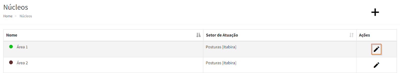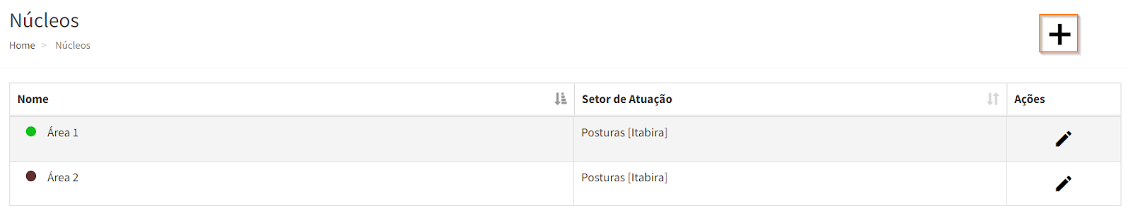 Para cadastrar, acesse o menu “Núcleos” e clique no ícone , localizado no canto superior direito da página.