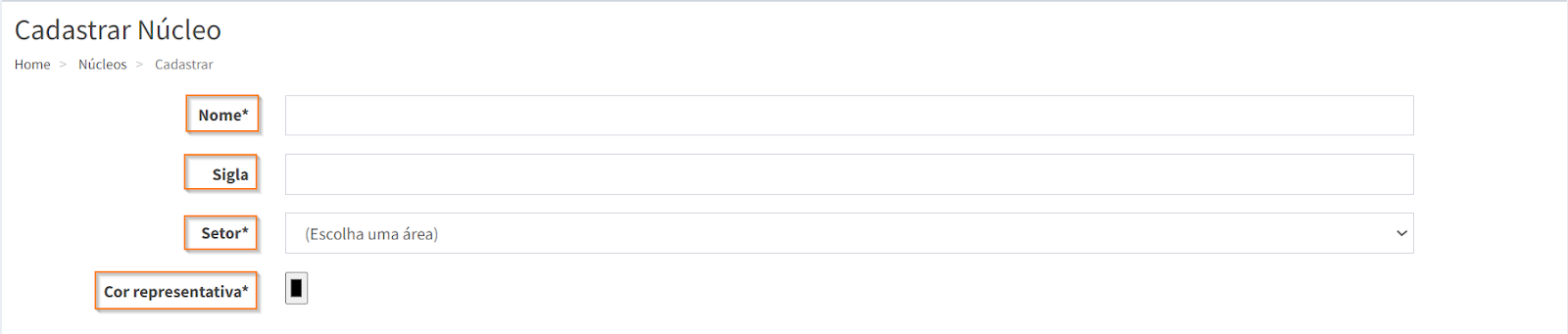 Insira o nome e, caso seja necessário, escolha também uma sigla. Selecione o setor ao qual o núcleo pertence e uma cor representativa para ele, clicando em .