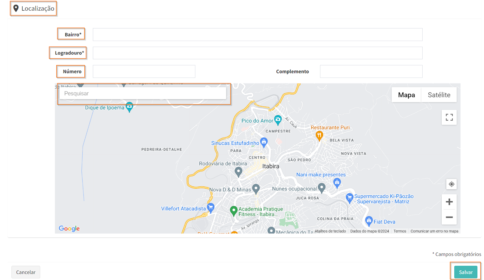 Em “Localização”, preencha as informações do endereço, é possível inserir pela busca manual através da barra de pesquisa ou marcar através do mapa interativo.