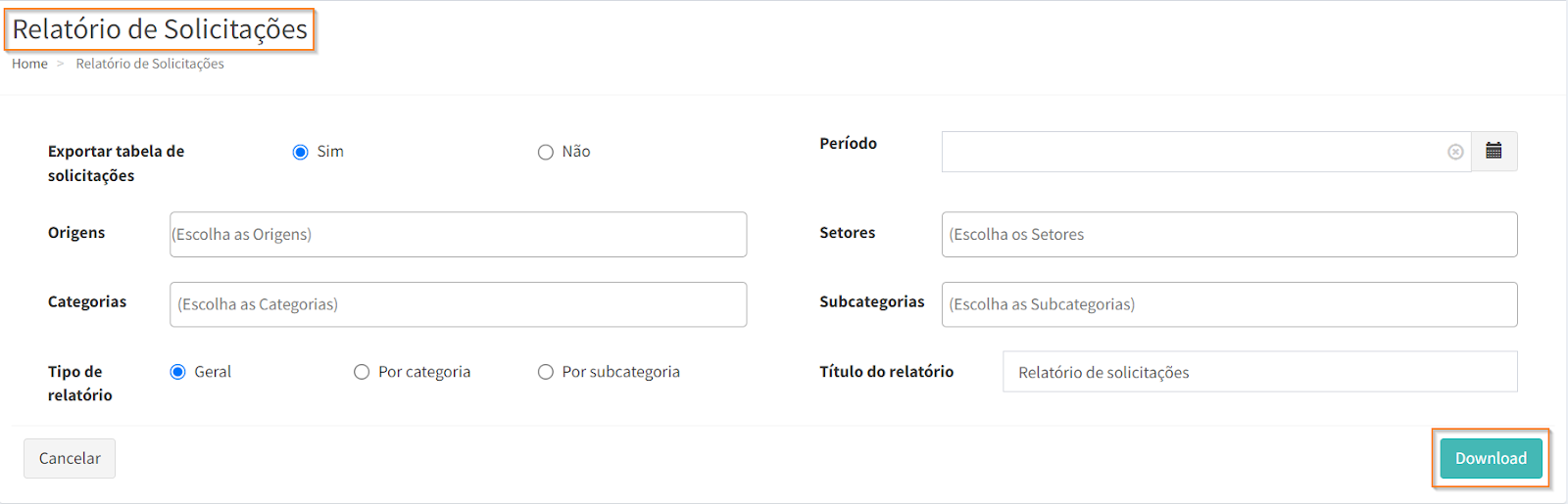 Além disso, é possível exportar ou não a tabela de solicitações, escolher o tipo de relatório (geral, por categoria ou por subcategoria) e inserir um título para ele. Após inserir as informações necessárias, clique em .