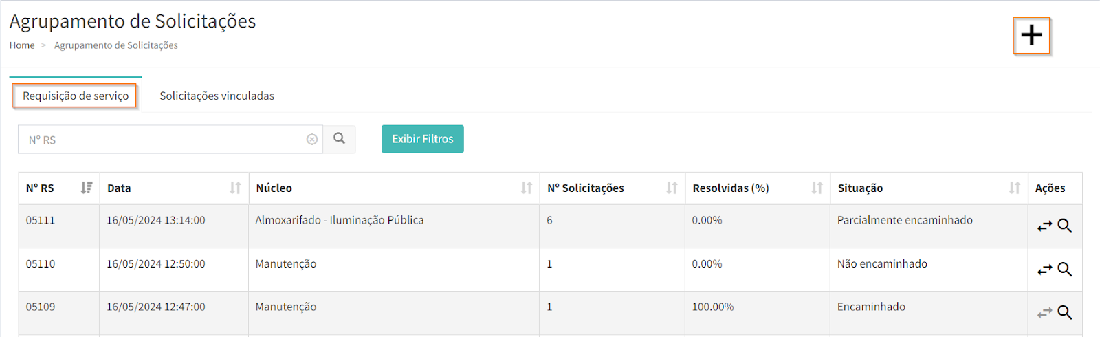 Para cadastrar, acesse o menu “Agrupamento de Solicitações” e, na aba “Requisição de serviço”, clique no ícone , localizado no canto superior direito da página.