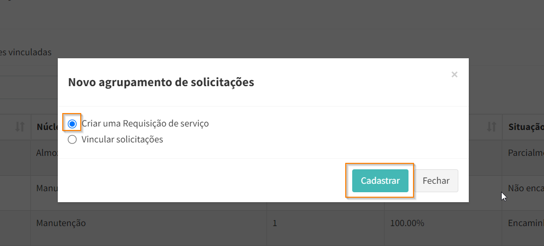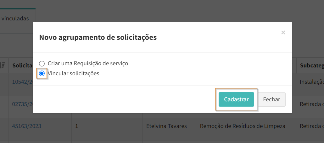 Selecione a opção “Vincular solicitações” e clique em .