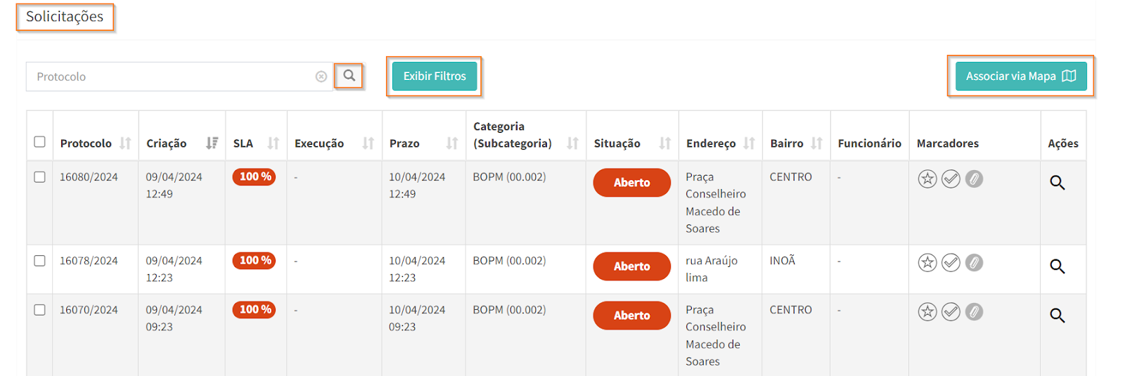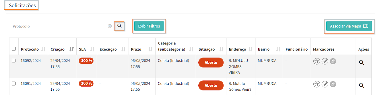Após selecionar as solicitações desejadas, via lista ou via mapa, estas aparecem na aba “Solicitações associadas”, na parte inferior da página. Revise as solicitações escolhidas e, caso precise remover alguma da lista, clique em .