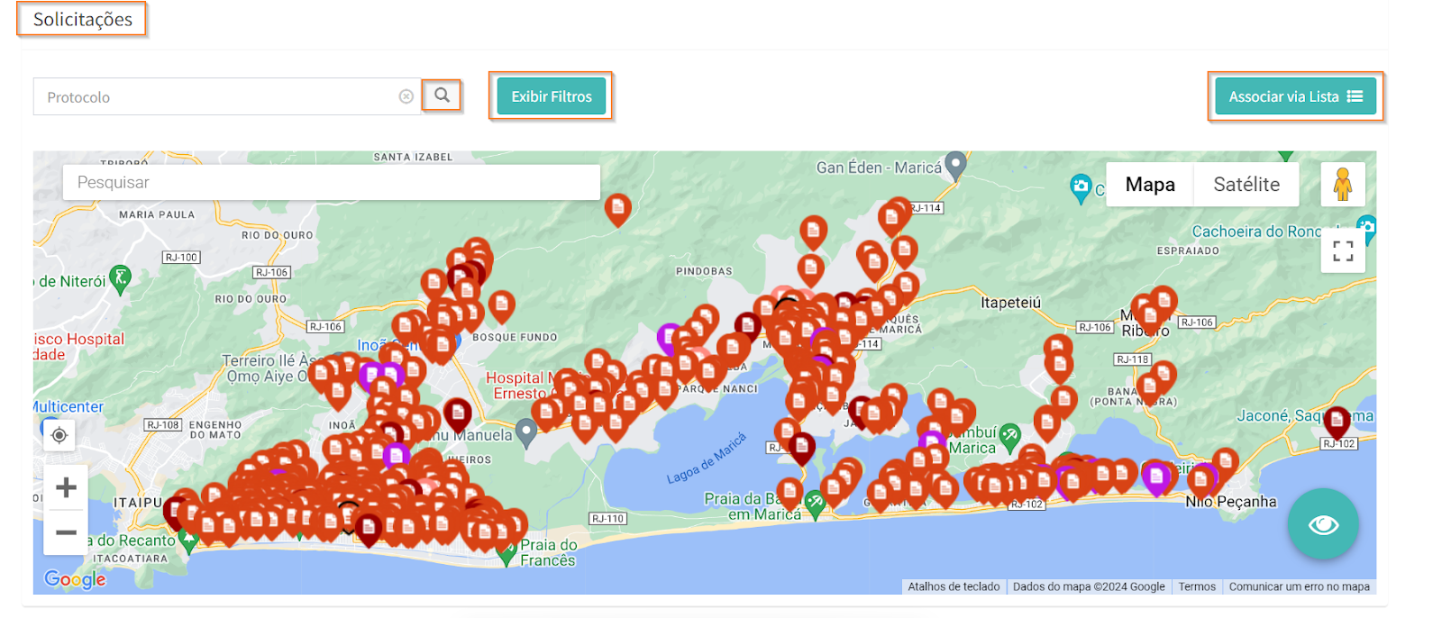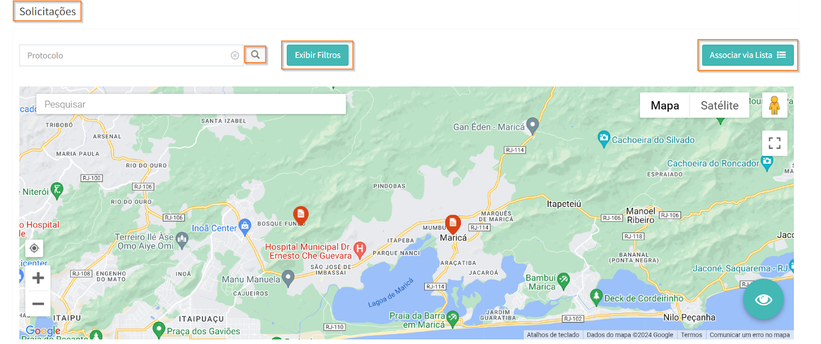 Na aba “Solicitações”, na parte inferir da página, é possível visualizar todas as solicitações filhas, associadas à mesma categoria e subcategoria da solicitação mãe, e escolher aquelas que serão vinculadas, via lista ou via mapa.