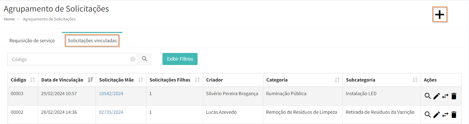 Para vincular solicitações, acesse o menu “Agrupamento de Solicitações” e, na aba “Solicitações vinculadas”, clique no ícone , localizado no canto superior direito da página.