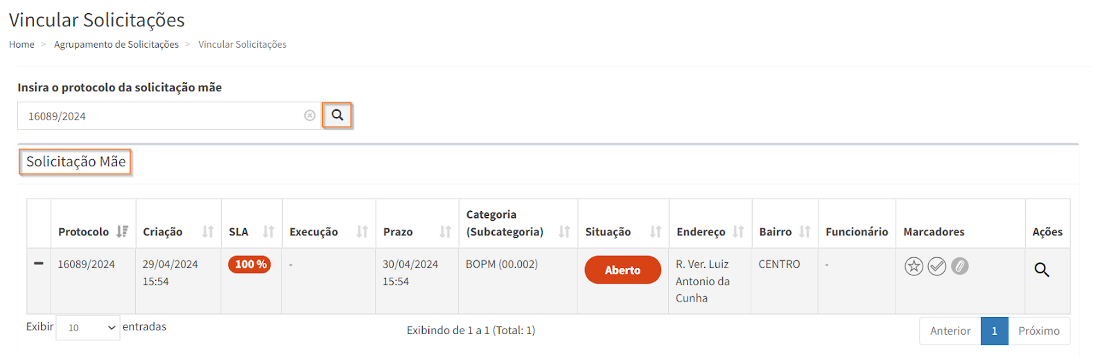 Insira o protocolo da solicitação mãe e clique em . Então, a solicitação escolhida é exibida na aba “Solicitação Mãe”.