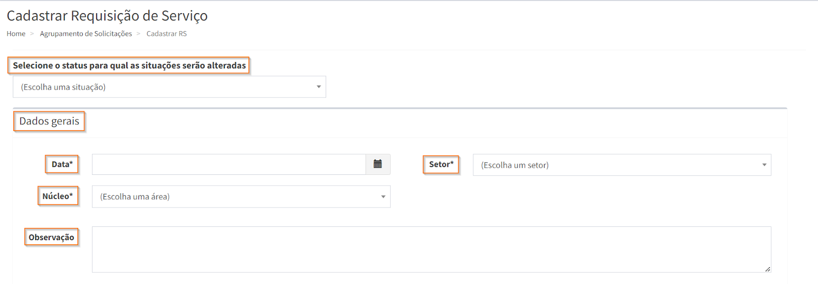 Selecione o status para qual as situações serão alteradas. Em “Dados gerais”, preencha a data, selecione o setor e o núcleo da Requisição de Serviço e, caso necessário, insira uma observação.