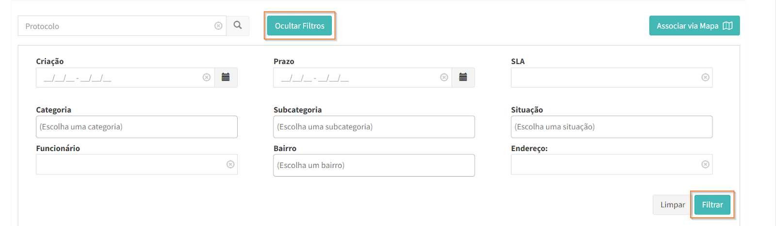 Ao clicar em “exibir filtros”, preencha os campos desejados e clique em .